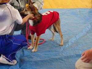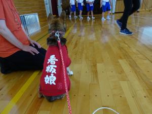 小学校に到着。 やっぱり、酔ってしまいました。気分転換に少しだけお 散歩です。 名札も付けて、準備万端なのですが、ちびはこの表情。 さあ、いよいよ児童のみなさんが体育館に集まりまし た。 ちびは学校の先生の脇に座って待っています。 |