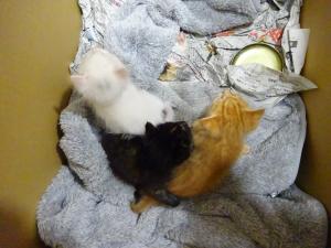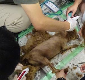 ハピまるで管理をするのにも支障があることから、全体的 に毛刈りをすることになりました。 身体が細く、慎重に行わなければいけないことから、麻 酔をかけ4人がかりで行いました。 小さな体ですが、全身の毛を刈るのに2時間かかりまし た。関節の部分は、そ-っと、かたまった毛を皮膚から そーっと、はがしながら無事に終了しました。 |