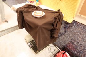 全部手作りの誕生会。 出来上がったケーキの写真を撮ろうとした時も、親方代 理から、「ちょっと、ケーキの下に黒っぽい布を敷いてから 撮りな、その方が見栄えが良いから。」とみんなでバタバタ 探しましたが見つからず。 その結果、親方代理が着ていたフリースを脱ぎ、この状 態での撮影でした。手作り感満載!! 写真の出来栄えを見た親方代理「ほ~ら。きれいじゃ ん。」 |