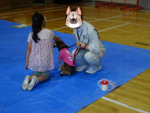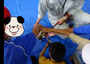 「ちび」も小学校への獣医師派遣事業に行っています。 この日は、大人数の授業でした。 ハピまるからは、親方代理が先生として登場! |