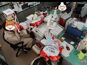 続いて事務所に、クリスマスツリーを作ります。ツリーの オーナメントは卒業犬猫の写真です。 絵面的に似合わない二人が、バランスを考えながら試行 錯誤。 「あ!これお気に入り!」 「目立つところに貼ろう!」 「これ、誰だ~?」