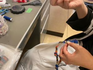 こちらは、首輪の調整です。 市販の首輪は、サイズが合わない事があるので、管理 担当職員が糸で縫ってサイズを合わせてくれます。 ハピまるでは問題がなければ、譲渡動物には首輪に慣 れてもらう練習をしています。 室内だから大丈夫!そんな事はありません。 大切な家族の一員を迷子にさせないために、所有者明 示を必ずしましょう! |