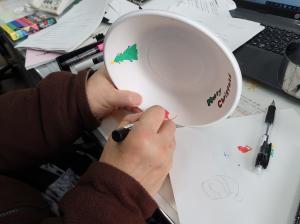 ということで、今年も管理担当職員にケーキを強引に依 頼しました。 さらには、事務所で忙しそうにしていた、親方代理にも強 引に 「器に絵をかいて欲しい」 とお願いしました。