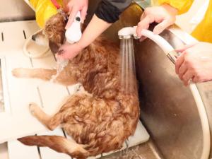 今日は管理担当職員を講師にシャンプー教室です。譲渡対象犬の「ぺス」に協力してもらい、基本的な洗い方からの授業です。