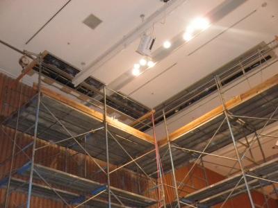多目的ホールのスライディングウォールについて、天井裏のレール部分に不具合が生じたため、