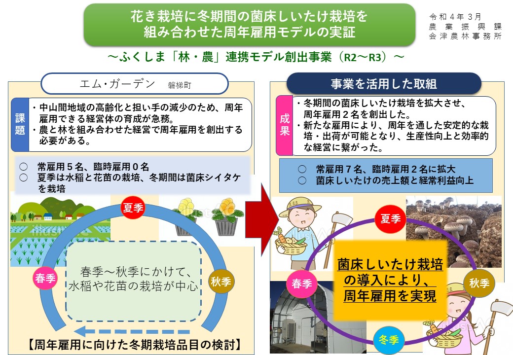 ふくしま「林・農」連携モデル創出事業(R2~R3)で花き栽培に冬期間の菌床しいたけ栽培を組み合わせた周年雇用モデルの実証に取り組みました。その成果は以下のとおりです。