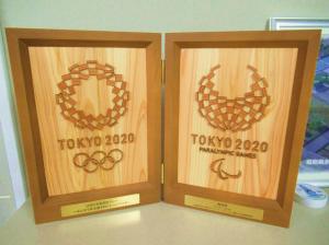 オリンピック・パラリンピック大会組織委員会から贈呈された県産材を使用した木製エンブレム楯(平成30年3月7日)