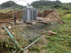 白沢揚水機場 主変圧器の被災状況 白沢揚水機場 主変圧器の復旧状況