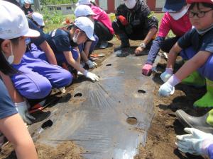 ○令和3年度 令和3年6月10日(木曜日) 開校式・種苗植え川谷小学校1~6年生の全児童と教員、地元農家の方々が参加し、開校式を行った後、それぞれの学年で希望した野菜の種苗植えを体験しました。 今年度育てる野菜は、サツマイモ、ピーマン、ナス、トマト、キュウリ、エダマメ、スイカ、サトイモ、トウモロコシの9種類で、各野菜の種や苗の形、植え方や育て方の違いについて実際に見て、触れて学ぶことができました。