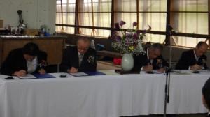 協定書への署名(左から、湯田 田島菌床きのこ生産振興会長、室井 NPO法人みなみあいづ森林ネットワーク代表、大宅 南会津町長、小山 JA会津よつば田島営農経済センター長)