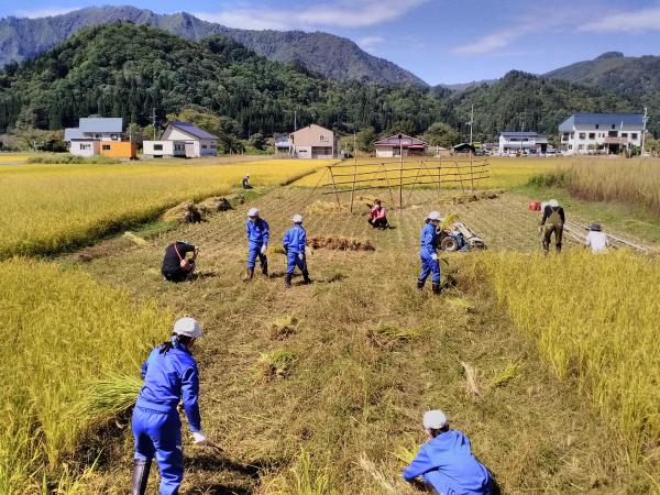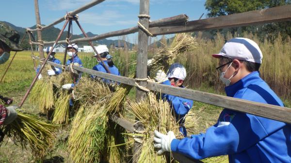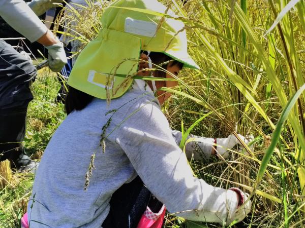 そこで、今回は手作業での稲刈りに挑戦してみました。ひと株ひと株、鎌で刈り取り、適当な大きさに束ねた後、竿に掛けて乾燥させるという作業になります。