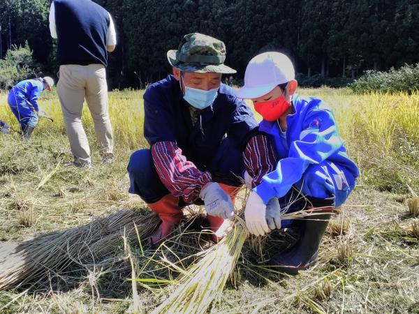 | 刈り取った稲を束ねる作業。丁寧に教わりましたが、ちょっと難しかったかな? | 助っ人登場! 保育所のお友達も手伝ってくれました、ありがとう。 |