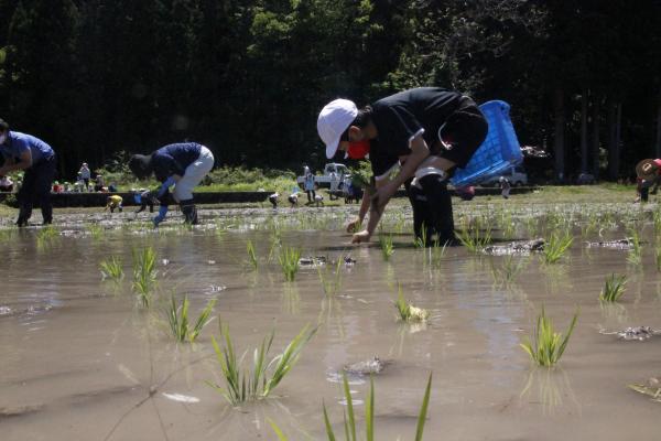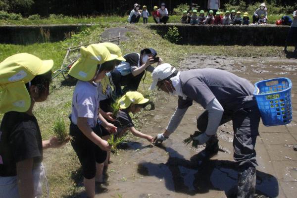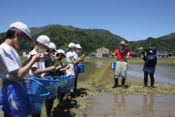 絶好の快晴のもと、5年生の児童による田植えが行われました。