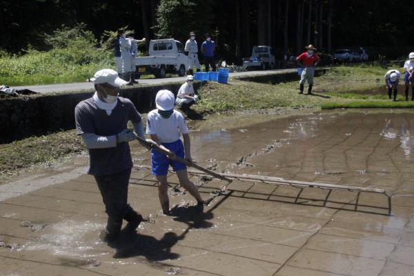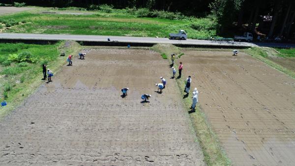 | 張り切って、田植えスタート! | 密にならないよう距離を保って、感染対策もバッチリ! |