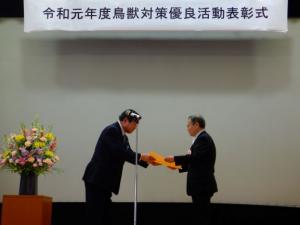 左:鳥獣対策優良活動表彰式で伊東良孝農林水産副大臣より賞状を受け取る渡部前区長