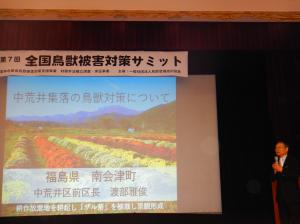 授賞式後に行われた鳥獣被害対策サミットでは、渡部雅俊前中荒井区長が取組について紹介しました。