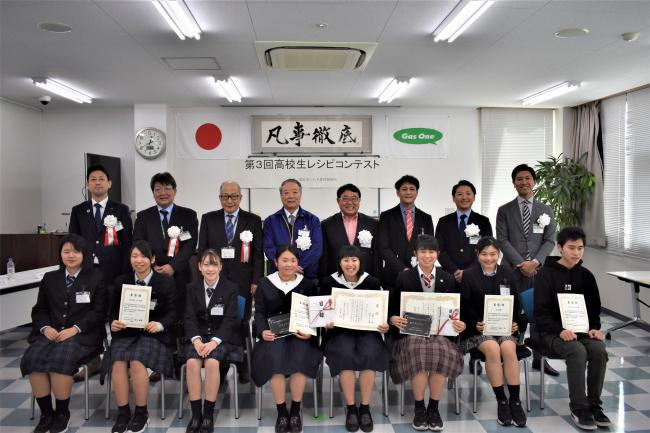 審査員からも「各作品のレベルが高く差を付けるのが大変だった。」「調理する手際も素晴らしかった。」「若い人たちの発想力に驚いた。」「料理の指導をして欲しい。」など素晴らしい評価をいただきました。表彰式の最後には、マスコミ等の記念撮影、インタビューが実施され終了しました。