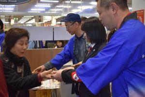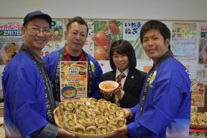 2月15 日(土)、スーパーマルトSC 高坂店のイートインコーナーにおいて、準グランプリの「まるごとトマトのスープ餃子(200食)」と14 日から限定販売を行っている「きのっこのこのこにぎにぎり(300 個)」の試食会を開催し、多くの方に味わっていただきました。