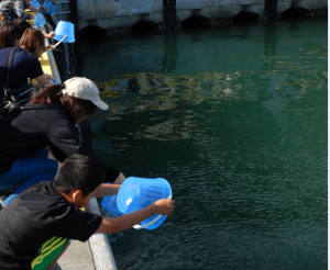 みんなでホシガレイの稚魚を放流しました。
