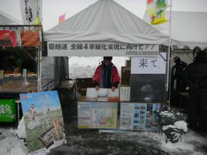 当日は雪がちらつき、ときおり吹雪となる時間帯もありましたが、多くの来場者にPRすることができました。