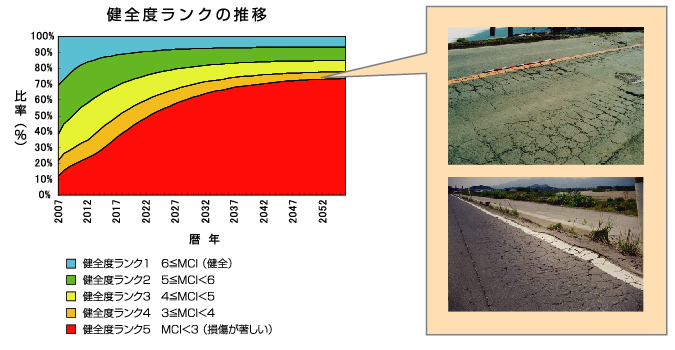 道路舗装は、自動車交通の荷重や気象の変化などの影響を常に受けるため舗装が老朽化し、ひび割れやわだち掘れといった損傷が発生します。損傷の著しい場合には舗装の打ち換え等を行い、安全で快適な道路を提供しています。しかし、膨大な舗装量を持つ福島県は、現行の舗装の維持管理予算および管理方法では、管理水準の低下が懸念されます。