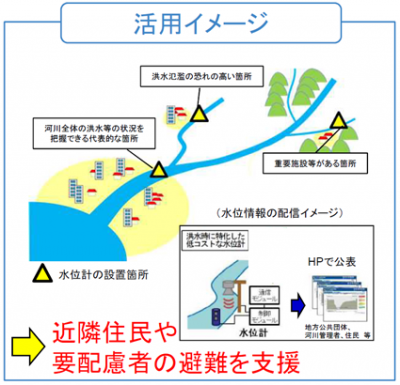 人家や重要施設(市役所や役場、病院、学校、高齢者施設など)に浸水の危険性が高く、的確な避難判断のための水位観測が必要な箇所を抽出し、洪水時の水位観測に特化した危機管理型水位計を設置します。