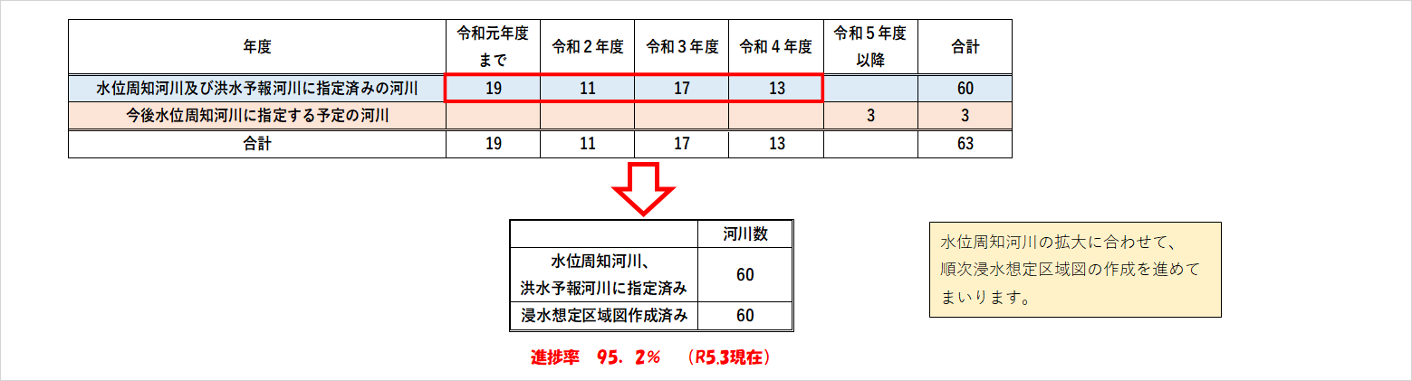 また、洪水浸水想定区域図の作成は令和3年7月の水防法の改正に伴い、対象河川が拡大されたことから、440河川で計画的に作成していきます。