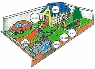 | 下水道接続に伴い、不要となった浄化槽を有効利用し、雨水の流出抑制、貯留水の利用、浄化槽の処分費の削減を図っています。(郡山市) | |