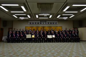 表彰式終了後は、主催者である内堀知事、福島民報社の矢森代表取締役専務、福島県建設業協会の小野会長、福島県建築士会の蛭田修二会長、長澤審査委員長を囲んで記念撮影を行いました。