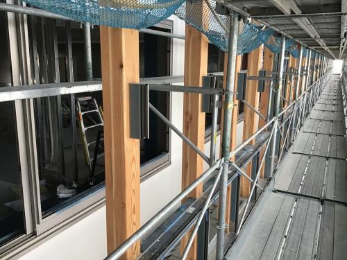 ○外装工事中(木混合カーテンウォール設置)