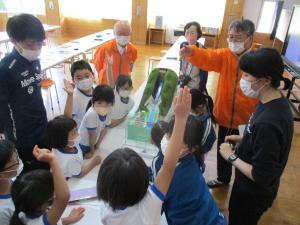 また、砂防ボランティア協会4名の方が模型を使い、土石流発生の仕組みや対策工事の必要性、避難の仕方などをわかりやすく説明していただきました。