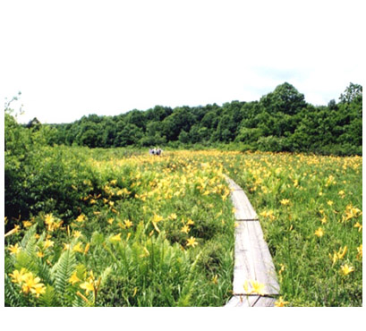 4月下旬のミズバショウに始まり、初夏のニッコウキスゲ、ワタスゲが湿原一面を彩る景色は見事です。また、秋の紅葉シーズンも見どころです。
