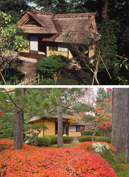 入組んだ茅葺き屋根、 板葺きの庇、 草庵風の茶室