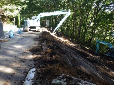 令和5年9月現在 崩落した法面を復旧するため、盛土工を行っています。