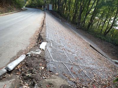 令和5年10月現在 盛土工が完了し、法面に植生マットを設置しました。