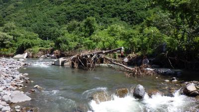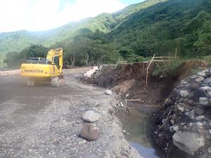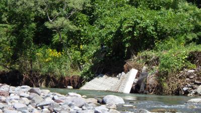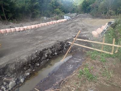 令和5年9月現在 崩落した護岸と警報局を除去し、工事用の仮設道路を設置しています。