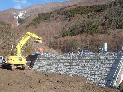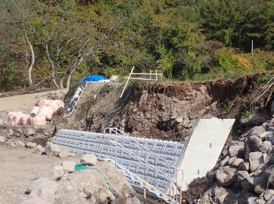 令和5年11月現在 崩落した護岸を復旧するため、大型ブロックを積んでいます。