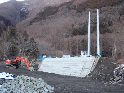 令和5年12月現在 崩落した護岸を復旧するため、大型ブロックを積み上げました。また、流失した警報局を新しく設置しています。