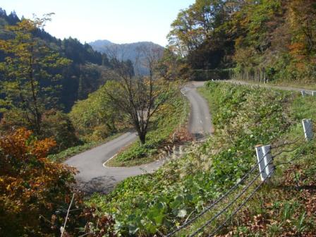 歩き始めてから15分位から曲がりくねった道がずーっと続く。路面幅はバスも通れる位の5~6mの道幅です。路面はアスファルト舗装です。