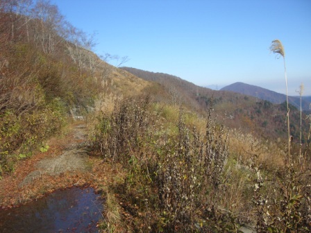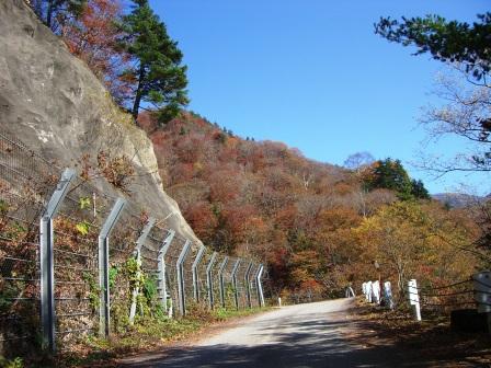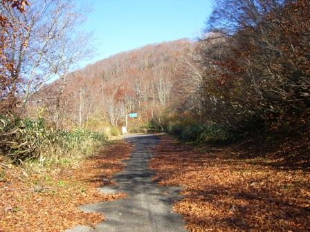 国道121号のバイパス交差点から車で約20分位走ると根小屋地点に到着。ここからは通行止め。徒歩でスタート。