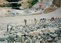 ダム堤体の建設が進められていきました。堤体の岩石(ロック)は、一番外側を覆うように施工し隙間には小さい石を間詰していきます。これは、貯水池内で起こる波から堤体を守る目的と景観維持の役割があります。