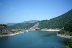 大峠道路から見た日中ダム 道路脇に続くマーガレット