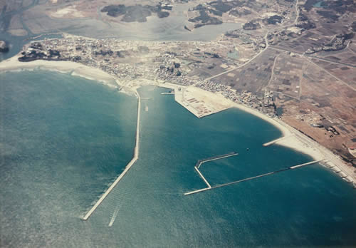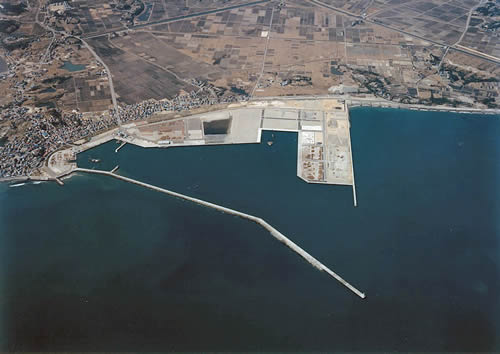 その後、昭和35年に地方港湾「相馬港」の指定を受け、翌年から本格的な整備がはじまりました。昭和45年に供用開始されると、その背後地の重要性が認められ、昭和49年には重要港湾に指定されました。さらに、昭和56年には全国初のエネルギー港湾としての指定を受け、相馬地域総合開発とあわせた整備が進みました。