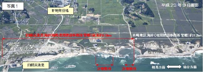 新地町の釣師浜漁港周辺では、海岸堤防の工事(相馬港湾)以外に様々な復旧・復興事業が実施されています。なかでも、海岸堤防の背後には新地町の防災緑地が計画されており、その盛土の高さは海岸堤防より高く計画されています。