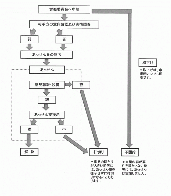 | あっせんは、労働委員会の会長が指名するあっせん員が当事者の間に立って双方の主張を確認し、話し合いを取り持つことで労働争議を解決に導く調整方法で、現在、3つの調整制度(あっせん・調停・仲裁)の中で最も多く利用されています。 | |||||||||||||||