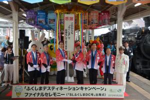 4月から展開してきた「ふくしまデスティネーションキャンペーン(DC)」のファイナルセレモニーがJR福島駅で開かれ、内堀知事が、フィナーレを飾る『SLふくしまDC号』に、出発の合図を送りました。