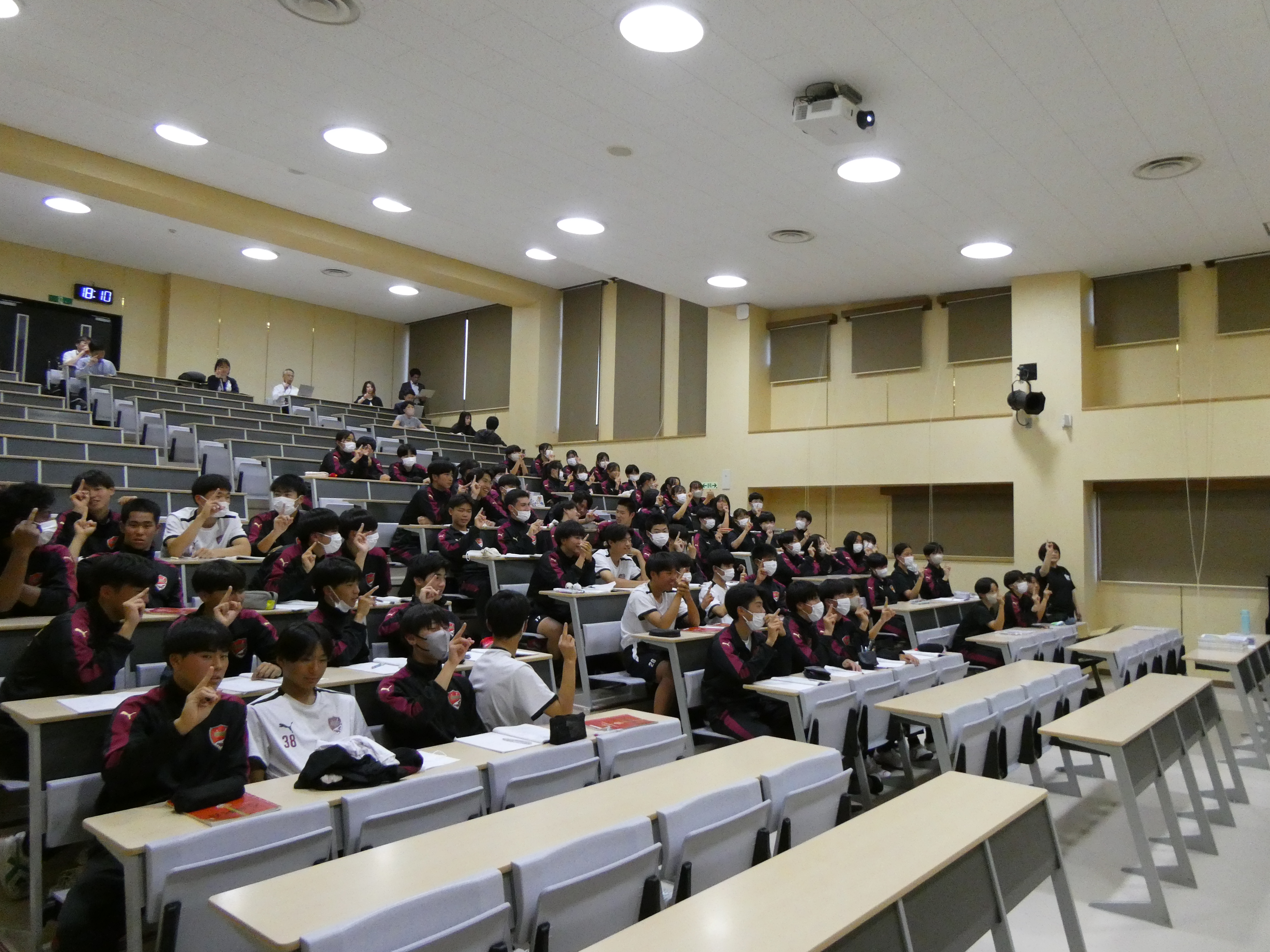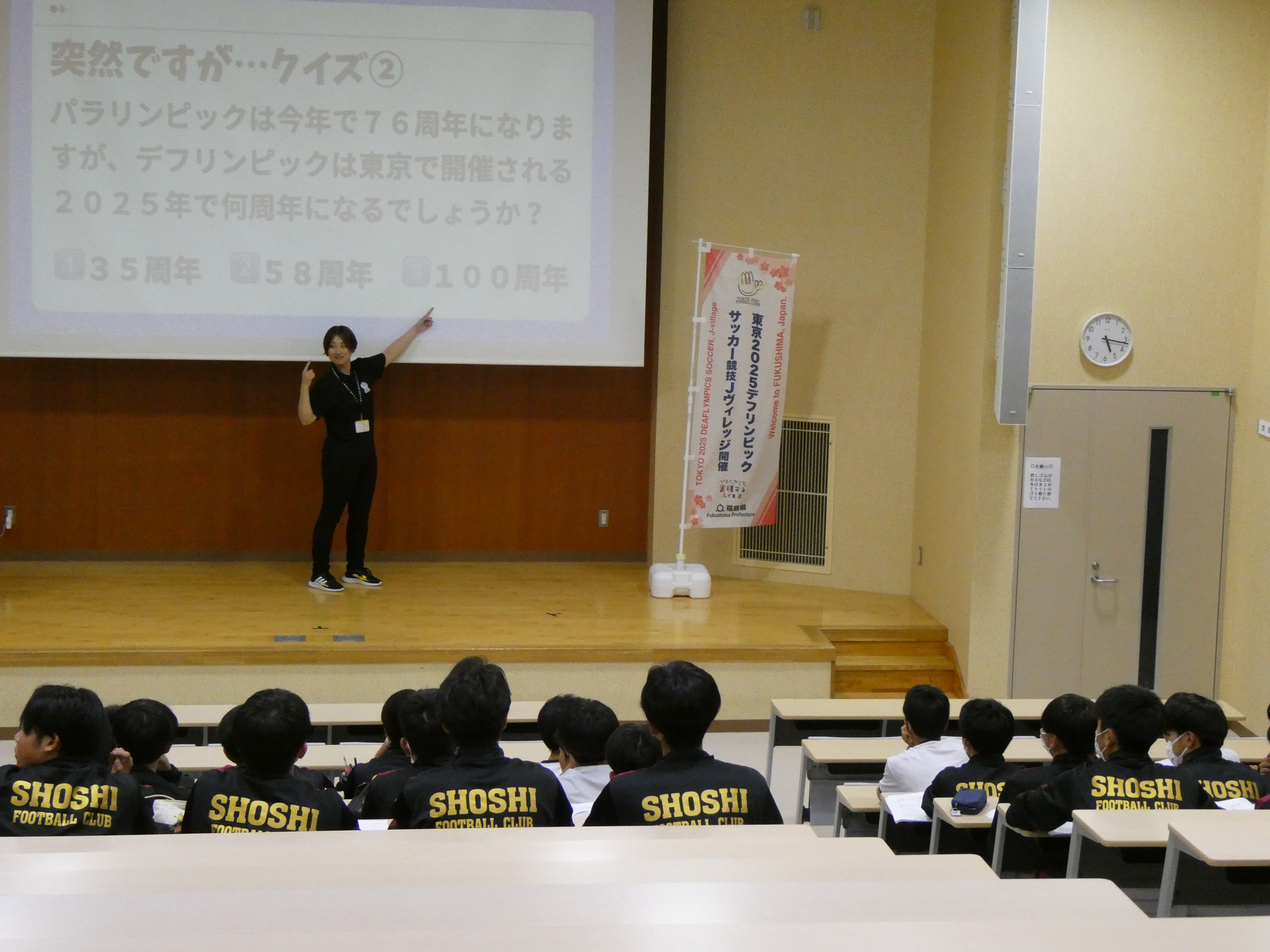 デフサッカー男子日本代表キャプテンの松元 卓巳(まつもと たくみ)選手に「音のない世界で伝わるもの」をテーマに日本代表になるまでの道のりや、デフリンピックにかける思いなどをお話しいただきました。みなさん真剣に話をきいていらっしゃいました。