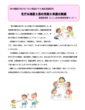 幼児教育の質の向上と幼小連携の充実を目的に、モデル地区3市(南相馬市、田村市、喜多方市)を指定し令和5年度から3年間の実践研究に取り組んでいます。令和5年度の取組をまとめましたので、是非、ご覧ください。