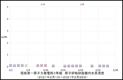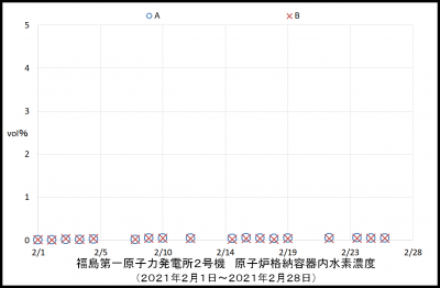 燃料デブリ等の強い放射線により冷却水の一部が分解されて水素が発生します。水素爆発の発生を防止するため、原子炉格納容器内に窒素を注入するとともに、水素濃度の監視も行っています。実施計画では格納容器内水素濃度が2.5vol%以下になるように求められています。