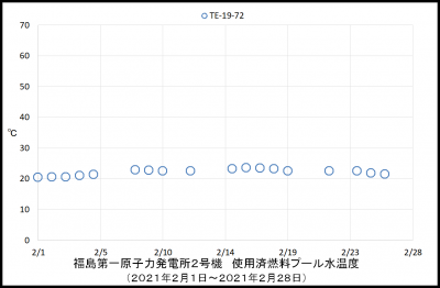 原子炉建屋最上階に位置する使用済燃料プール水温を示しています。1号機には292体、2号機には587体の使用済燃料が保管されています。なお、3号機については令和3年2月に使用済燃料プールからの燃料搬出が完了しています。